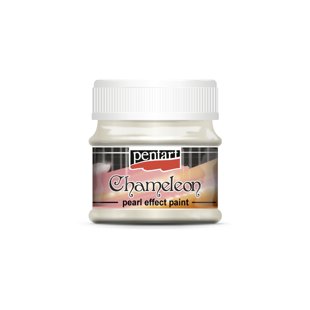 Dvojfarebné akrylové farby Chameleon značky PENTART s perleťovým efektom. Farby obsahujú farebné pigmenty, ktoré im dodávajú na namaľovanom povrchu dojem, že sa farebnosť z každej strany predmetu líši. Odtieň farby sa mení v závislosti od uhla dopadu svetla. Tento efekt je najviac značný na vypuklých povrchoch.