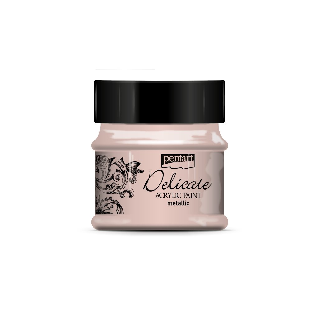 Delicate metal farby od PENTART sú akrylové farby na vodnej báze špeciálne vyvinuté pre dekoračné účely. Táto farba sa vyznačuje vysokou kvalitou a ponúka širokú škálu metalických odtieňov. Obsahujú lesklé, trblietavé častice, ktoré vytvárajú pôvabný, metalický efekt.