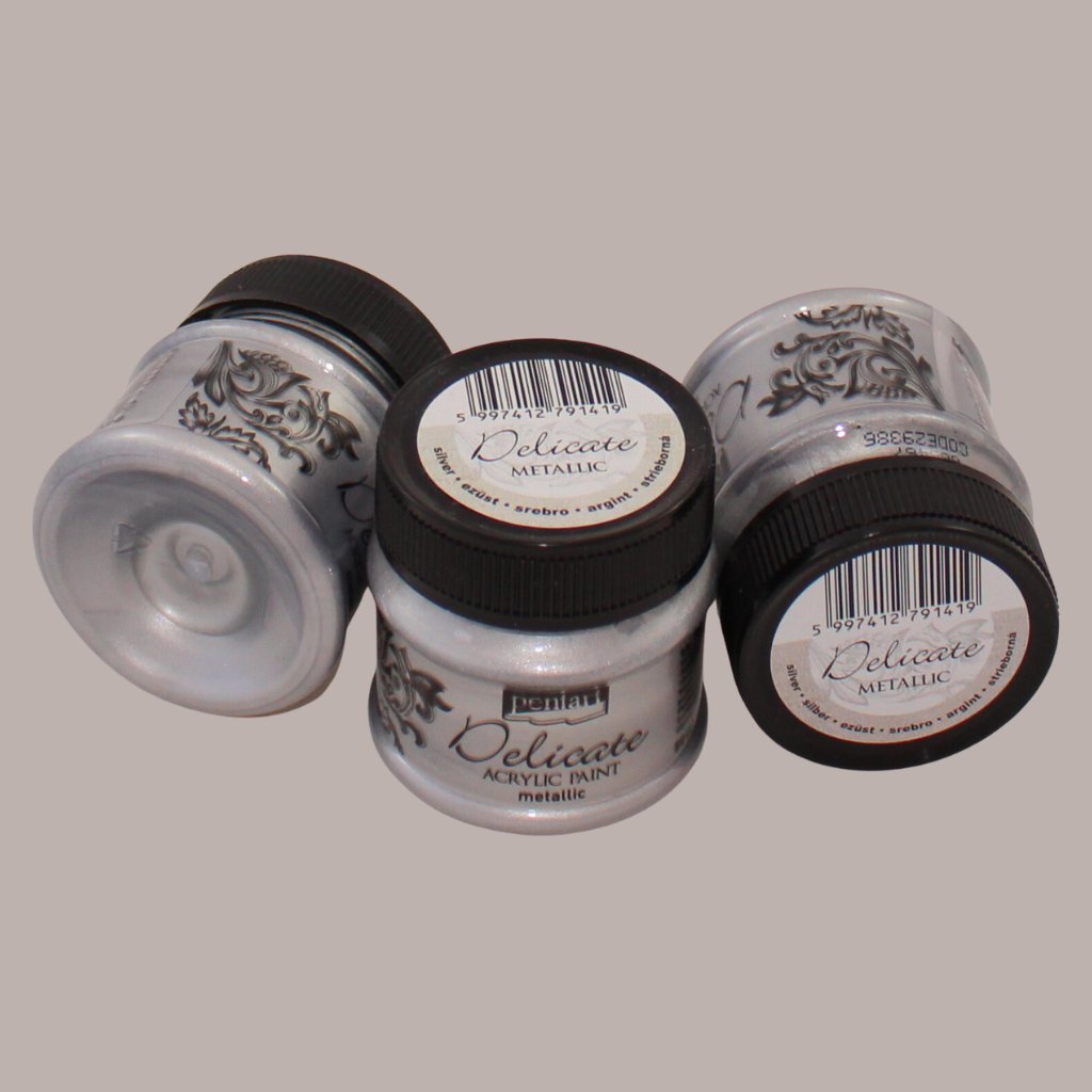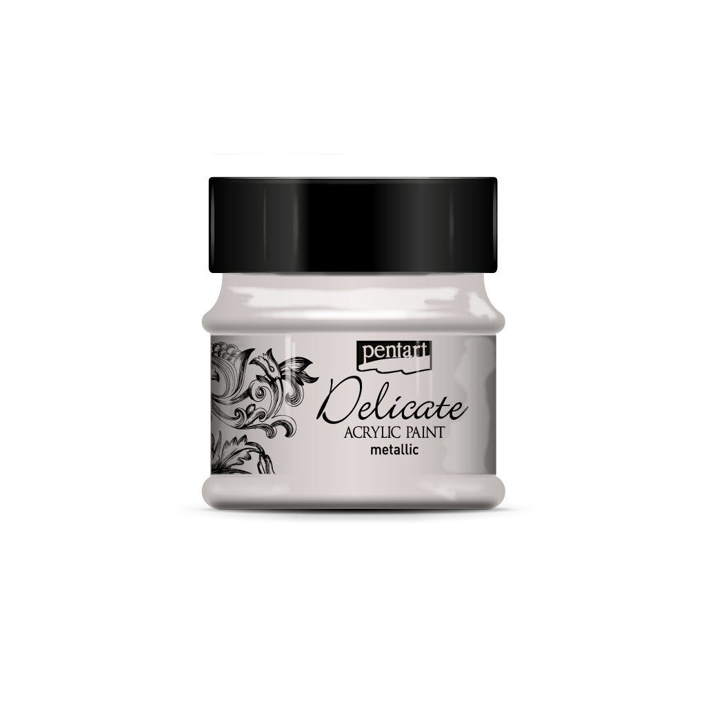 Delicate metal farby od PENTART sú akrylové farby na vodnej báze špeciálne vyvinuté pre dekoračné účely. Táto farba sa vyznačuje vysokou kvalitou a ponúka širokú škálu metalických odtieňov. Obsahujú lesklé, trblietavé častice, ktoré vytvárajú pôvabný, metalický efekt.