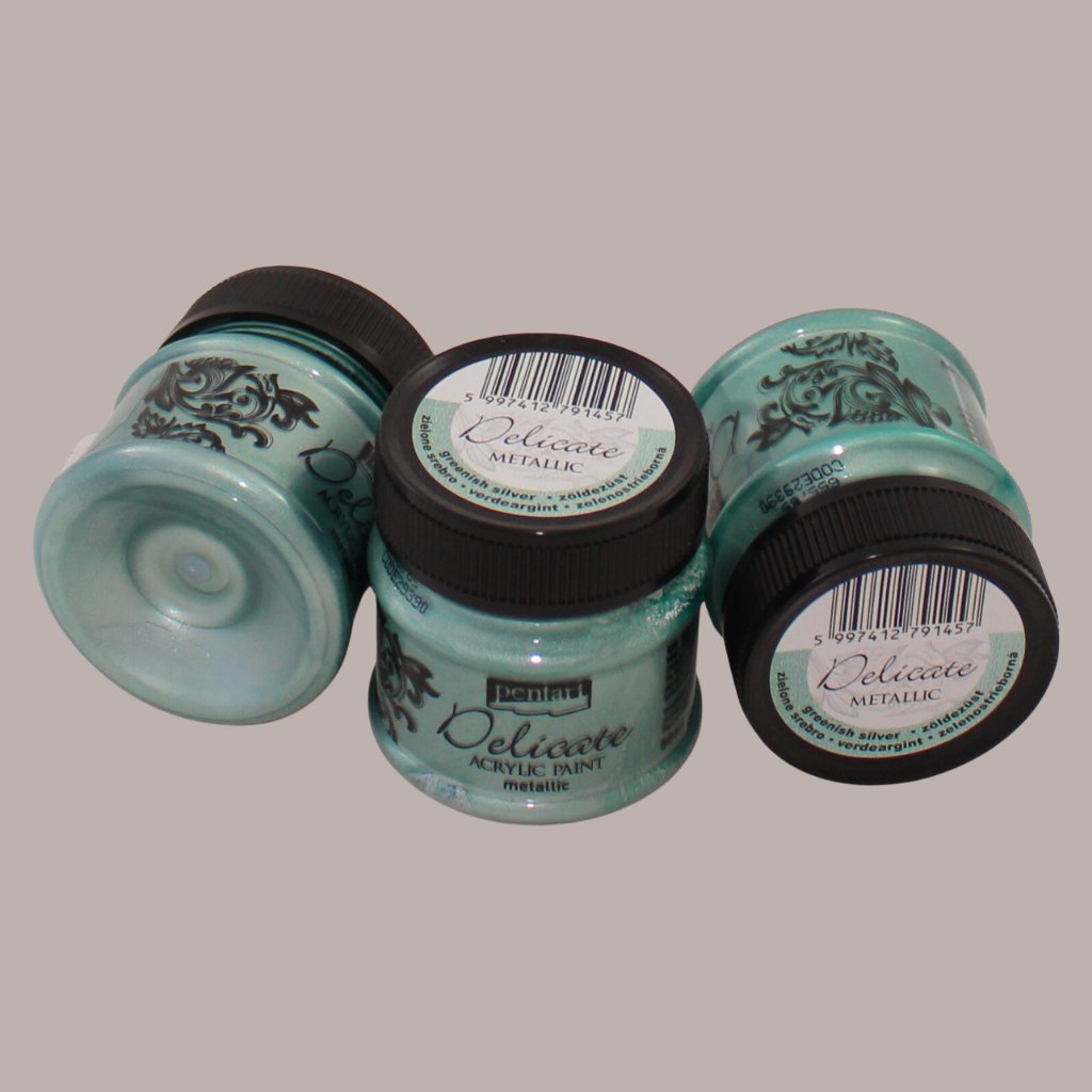 Delicate metal farby od PENTART sú akrylové farby na vodnej báze špeciálne vyvinuté pre dekoračné účely. Táto farba sa vyznačuje vysokou kvalitou a ponúka širokú škálu metalických odtieňov. Obsahujú lesklé, trblietavé častice, ktoré vytvárajú pôvabný, metalický efekt.