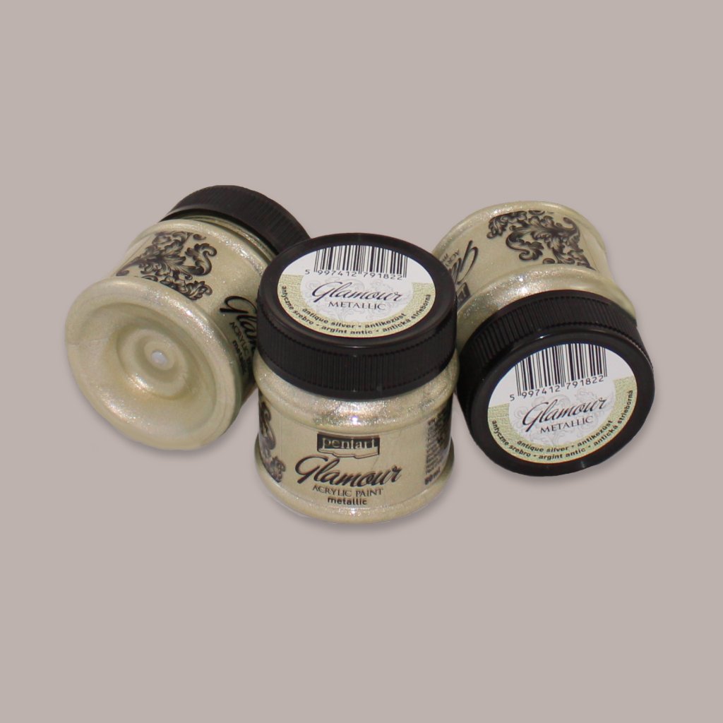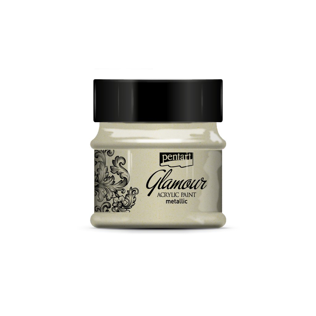 Pentart Glamour je akrylová farba na vodnej báze s vysokým obsahom pigmentov a jemných trblietavých častíc. Vytvára výrazný metalický efekt, ktorý dodá každému dielu luxusný charakter. Farba je rýchloschnúca, bez zápachu a vhodná na rôzne povrchy – od dreva po keramiku.