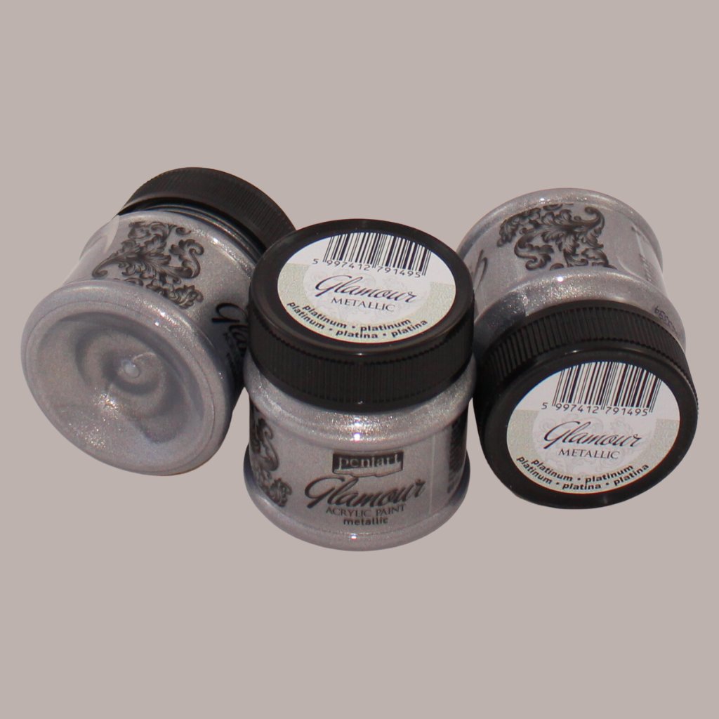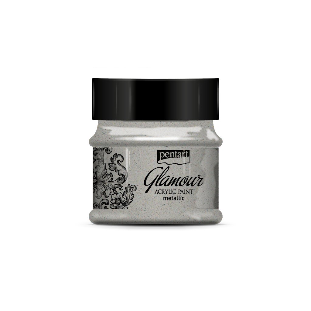 Glamour metal farby od PENTART sú akrylové farby na vodnej báze špeciálne vyvinuté pre dekoračné účely. Táto farba sa vyznačuje vysokou kvalitou a ponúka širokú škálu metalických odtieňov. Pomocou vysokého podielu špeciálnych pigmentov farby Glamour metal sú vhodné na vytvorenie strieborného alebo zlatého metalického lesku na povrchoch. Ak chcete zvýšiť lesk trblietok, odporúča sa použiť pod ňu matnú akrylovú farbu rovnakého odtieňa.